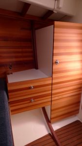 Die Yacht bekommt ein Hubschwert mit 600 kg Ballast, welches von 1m Tiefgang auf 2,4m abgesenkt werden kann. Passend dazu das Steckruder mit Notauslösung bei Grundberührung.