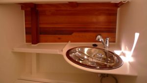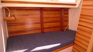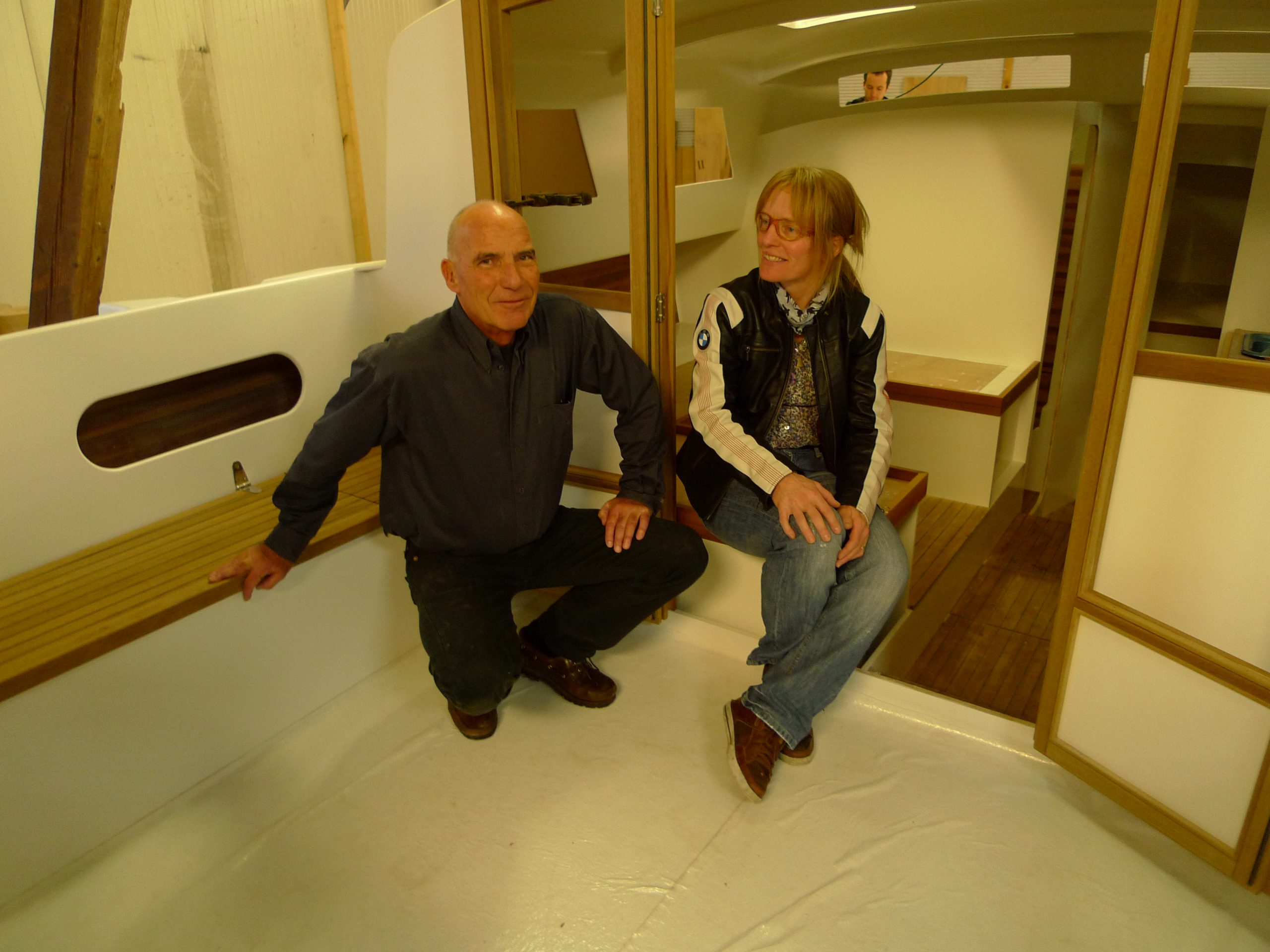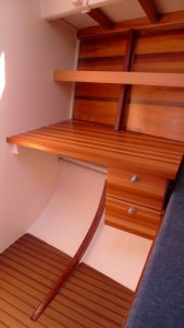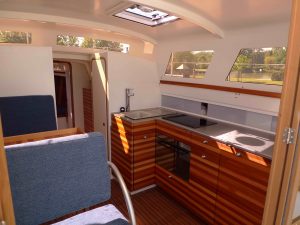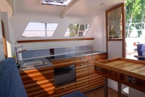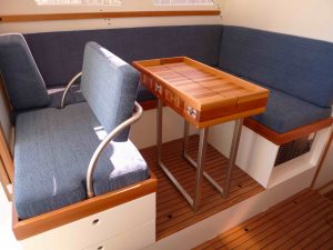 Interessant ist die Cockpitsituation, hier kann man außen – wie üblich – auf den Seitenbänken sitzen. Im Cockit selbst ist eine Art „Kommandopult“ mit Klapptisch drum herum und zudem jede Menge Platz, um im Hafen Klappstühle aufzustellen.