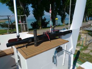 Achtern im Cockpit befindet sich der 22 PS Außenborder in einer geschlossenen Box, an der das Ruder angehängt wird.